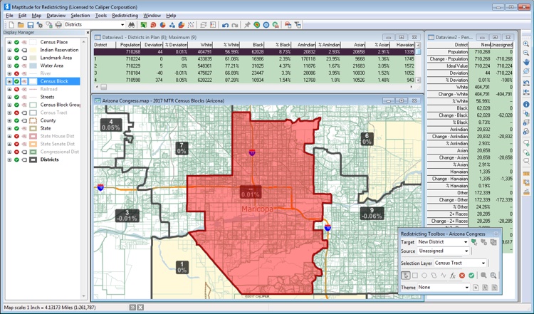 Maptitude also provides a map library that contains pre-designed maps listed by Census category. Maptitude for Redistricting includes tools for creating, analyzing, and mapping congressional, state legislative, city council, county commission, school, water, or any other type of districts.